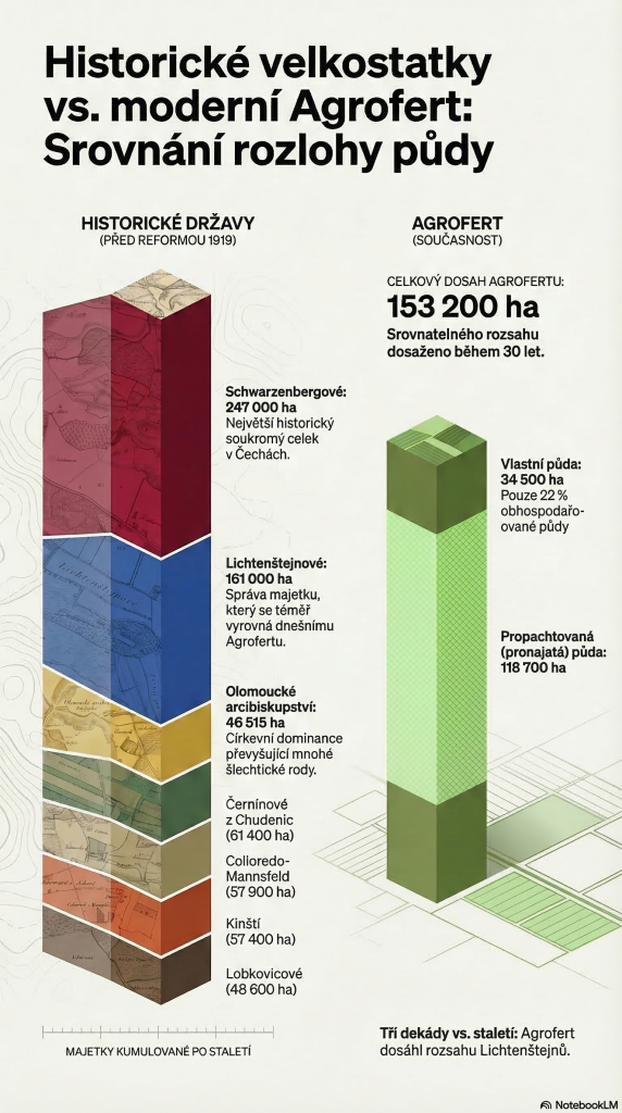 Grafika níže zjednodušeně srovnává šlechtické a církevní pozemky na území Československa před pozemkovou reformou 1919–1920 s dnešním Agrofertem (součet obhospodařované půdy v ČR a na Slovensku)