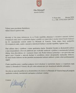 Dvaadvacet evropských ministrů kultury, se zpožděním se připojil i český ministr Oto Klempíř, podepsalo dopis, v němž vyzvalo prezidenta Bienále Pietrangela Buttafuoca, aby znovu zvážil účast Ruska, a varovali, že poskytnutí prominentní kulturní platformy normalizuje agresivní válku.