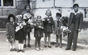 Lidické děti po válce, zleva Veronika Hanfová, Libuše Müllerová, vzadu Věra Vokatá, Jana Müllerová, Hana Špotová, Václav Zelenka, Václav Hanf. Foto: se souhlasem Paměť národa