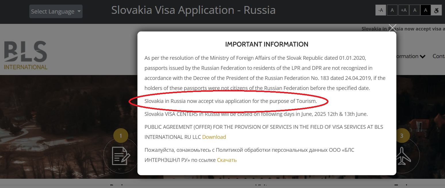 To, že Slovensko opět udělení víz umožňuje, však potvrzuje web vízového operátora BLS International, který žádosti zpracovává: „Slovensko v Rusku nyní přijímá žádosti o víza pro účely turistiky.“