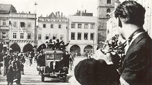 České Budějovice 9. května 1945. V pozadí funkcionalistická budova městské spořitelny, kde o šest dní později dojde k sedminásobné vraždě. Zdroj: archiv autora, se souhlasem Paměť národa