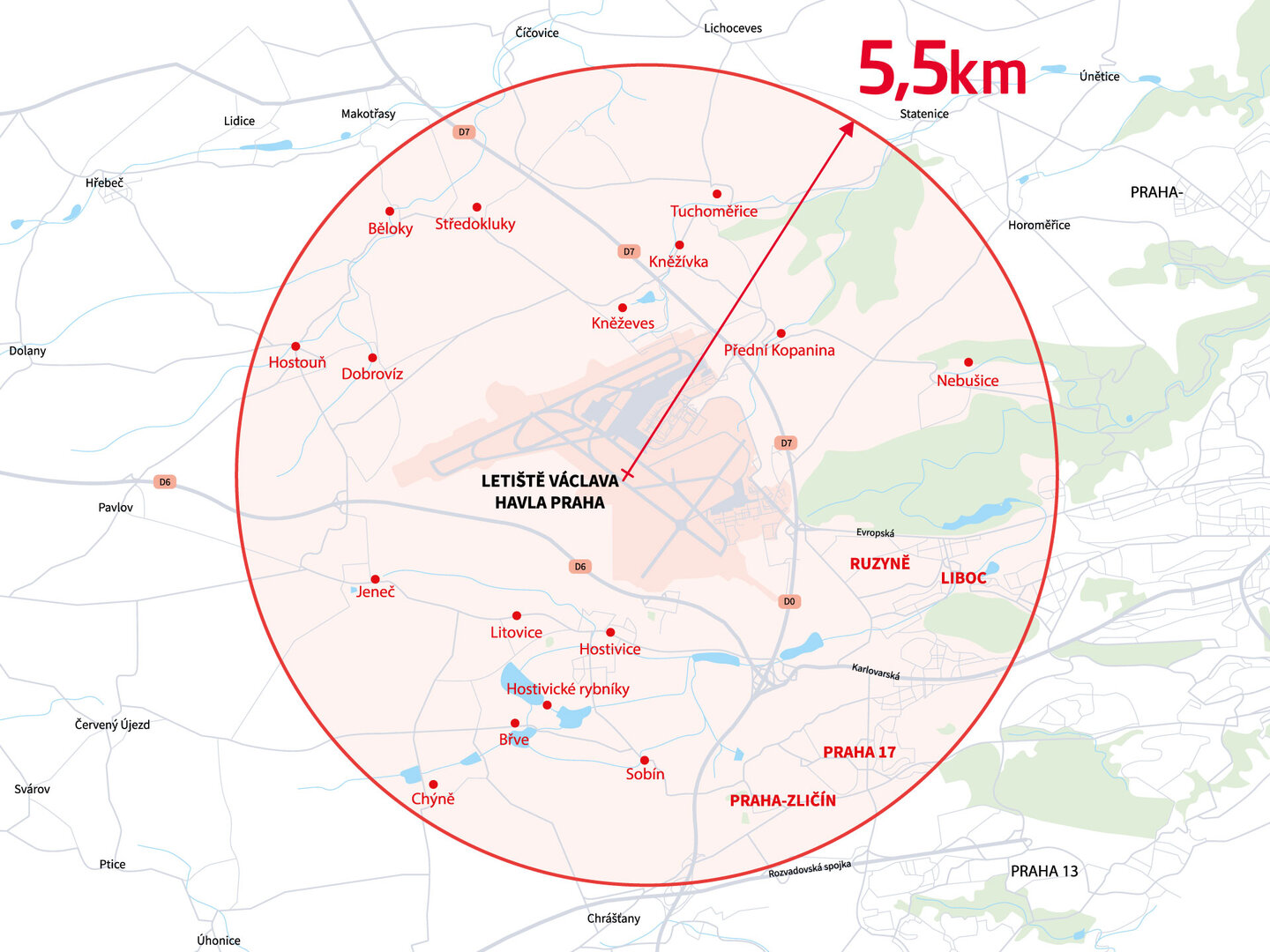 Prostor kolem pražského letiště s přísnějšími pravidly pro pohyb dronů. Zdroj: se svolením Letiště Praha