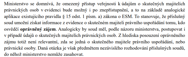 V současnosti prý ale Ministerstvo spravedlnosti připravuje novelu zákona o Evidenci skutečných majitelů. Jak slibuje, podrobně prý upraví pravidla přístupu veřejnosti na základě prokazování tzv. oprávněného zájmu.
