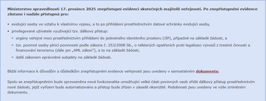 A proč že se Evidence skutečných majitelů počínaje zítřkem (17. prosincem 2025) v Česku veřejnosti uzavírá?