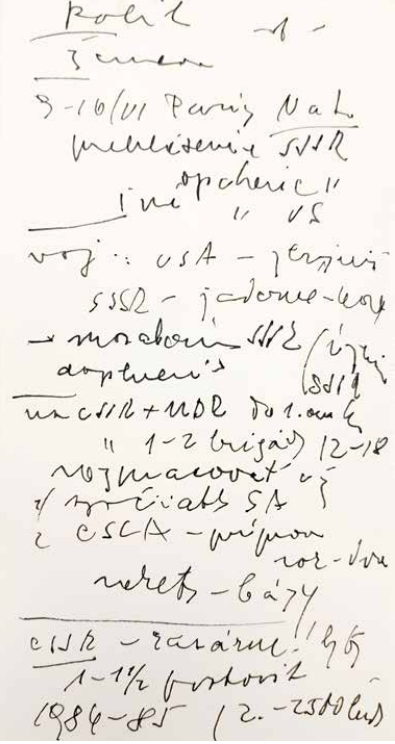 - Lístek 10 x 20 cm s vlastnoručními poznámkami Gustáva Husáka z jednání se sovětskými emisary. FOTO: se svolením Národní archiv