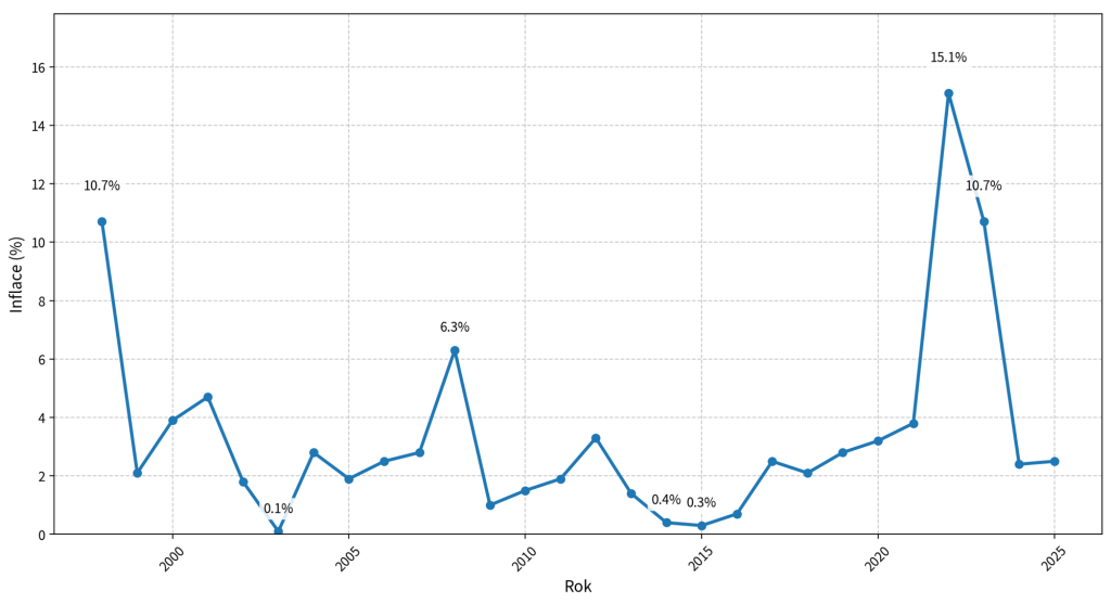 Pokud se podíváme na delší horizont, zjistíme, že inflace není výjimka, ale pravidlo. Za posledních 10 let se v Česku pohybovala v průměru kolem 3,5 procenta ročně. To znamená, že ceny od roku 2015 vzrostly zhruba o polovinu. Jinými slovy, to, co stálo 100 korun, dnes stojí přibližně 150. A to i přesto, že jsme mezitím zažili období klidu.