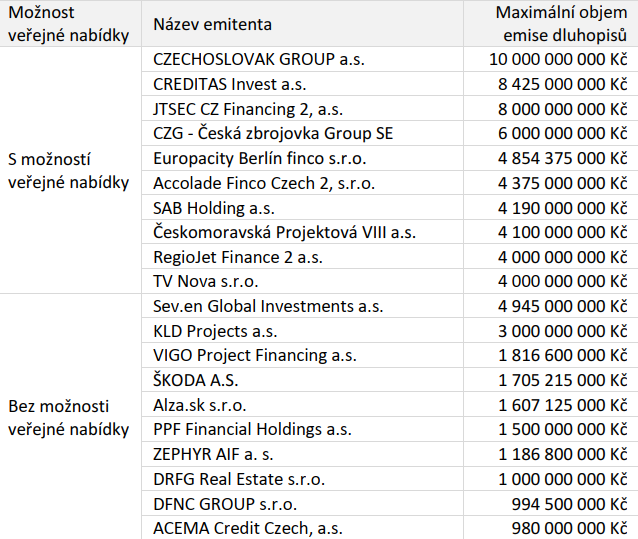 (členěno dle možnosti veřejné nabídky, maximální objem emise, v Kč)