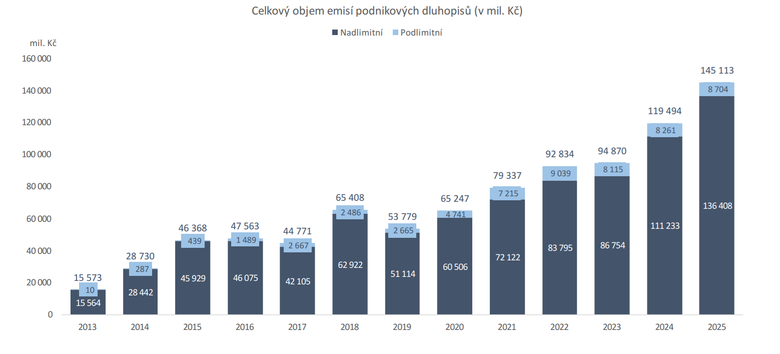 Od roku 2012, kdy se uvolnily podmínky pro vydávání firemních dluhopisů, zažil tento trh v Česku rozmach. Mezi lety 2013 a 2025 vzrostl objem těchto dluhopisů z 15,6 mld. Kč na 145,1 mld. Kč v loňském roce. To je vůbec nejvíce za celé sledovaní období.