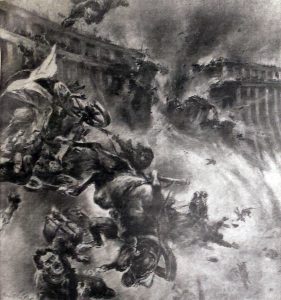 9. jezdecká divize nakládala koně na bárky, ale 5. jezdecká divize bárky neměla a její koně překonávali Dněpr plavbou.“