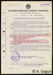 Usnesení GKO o vyhození Dněperské vodní elektrárny do povětří. Opsal a podtrhl A. Gogun. Foto: archiv autora