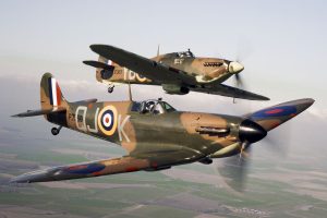 Hawker Hurricane mk. I, kterým byla vyzbrojena čs. peruť v bitvě o Británii, a pod ním Supermarine Spitfire mk I. v maspvání, v jakém létaly za této bitvy. Zdroj: Wikimedia, se souhlasem Paměť národa