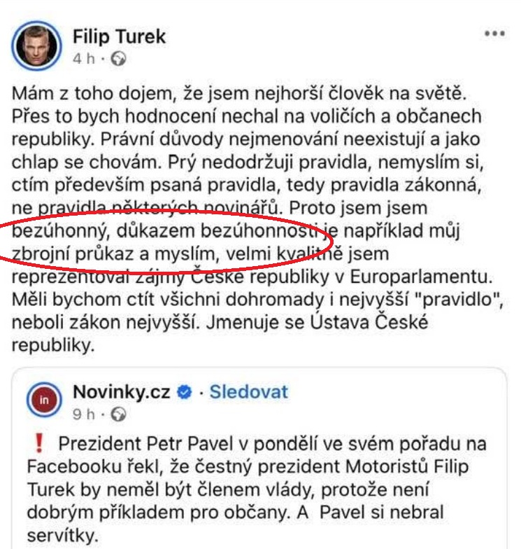 POZNÁMKA. Filip Turek vytasil na svou obranu těžký kalibr. Když prezident prohlásil, že Turek nemá být členem vlády, protože není dobrým příkladem pro občany a nedbá na zákony, opáčil, že on ctí zákonná pravidla a že důkazem jeho bezúhonnosti je fakt, že vlastní zbrojní průkaz.