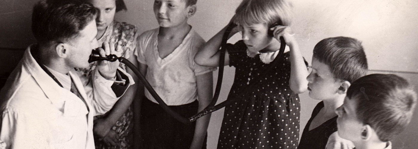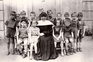 Sestra Paulína Doušová se svými svěřenci ve smíchovském ústavu pro neslyšící roku 1955 krátce předtím, než byla donucena svou činnost ukončit. Zdroj: archiv Paulíny Doušové, se souhlasem Paměť národa