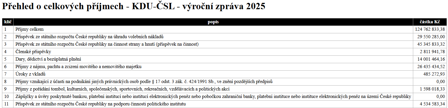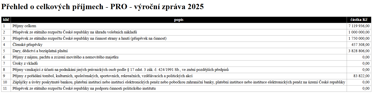 Přehled příjmů všech politických stran zastoupených v Poslanecké sněmovně