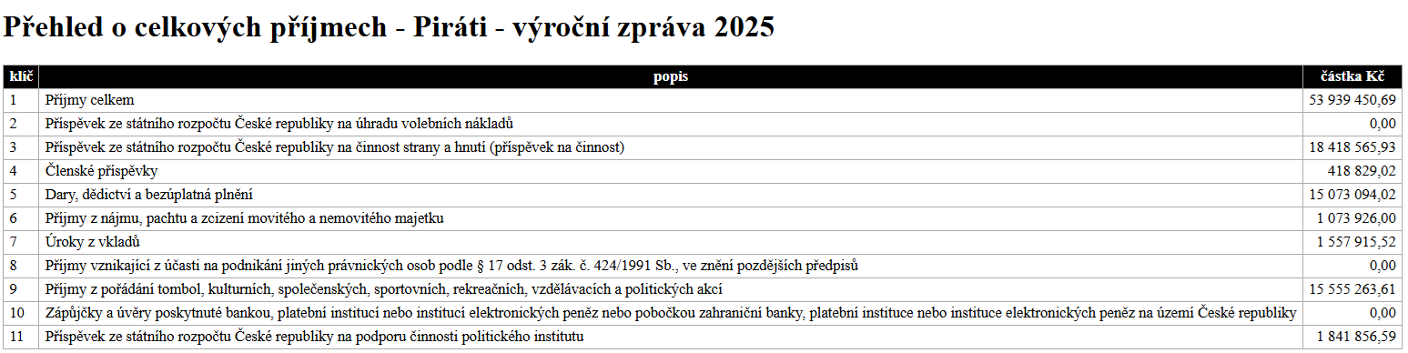 Piráti jsou s 15,6 milionu jedničkou v položce „příjmy z pořádání tombol, kulturních, společenských, sportovních, rekreačních, vzdělávacích a politických akcí“.