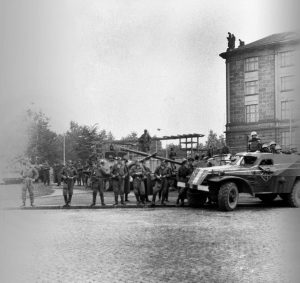 Druhý den se vydala fotit k budově ÚV KSČ (dnešní ministerstvo dopravy), která byla doslova v obležení ruských vojáků. „Přichomýtla jsem se k nějaké skupince protestujících občanů. Začali jsme zpívat hymnu a přistoupili jsme blíž k budově. Stáli jsme metr, možná dva metry od vojáků. V tu chvíli dostali pokyn, aby na nás mířili,“ vzpomíná Hana Hamplová na dramatické okamžiky a pokračuje: