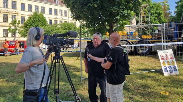 Součástí šturmu byla i výzva, aby lidé využili možnosti natočit rozhovor s redaktorem Milanem Zadělákem, který je rovněž na místě přítomen. Což nás dostává ke druhé skupině přítomných novinářů. Zdravím se srdečně s kolegy z ČTK a Litoměřického deníku, mávneme na sebe s televizáky i krajánky Práva.