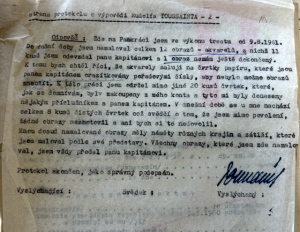 „Zde na Pankráci jsem ve výkonu trestu od 9. srpna 1961 do dneška namaloval celkem 12 obrazů, akvarelů, z nichž jsem 11 kusů odevzdal panu kapitánovi a 1 obraz ještě nemám dokončený. K tomu bych chtěl říci, že akvarely maluji na čtvrtky papíru, které jsou panem kapitánem orazítkovány pořadovými čísly, aby nebylo možné obrazů zneužít. (…) Mnou dosud namalované obrazy měly za námět různé krajiny a zátiší, které jsem maloval podle své představy. Všechny obrazy, které jsem zde namaloval, jsem vždy předal panu kapitánovi.“