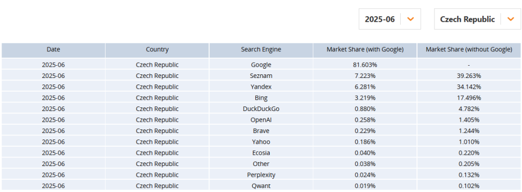Pro srovnání: Slovensko vykazuje podíl Yandexu na trhu vyhledavačů podíl jen 0,267 %, Rakousko 0,871 % a Maďarsko 0,245 %. Globálně má podle stejného zdroje Yandex podíl jen 1,929 %. Ale Česko je prý nad šesti procenty.