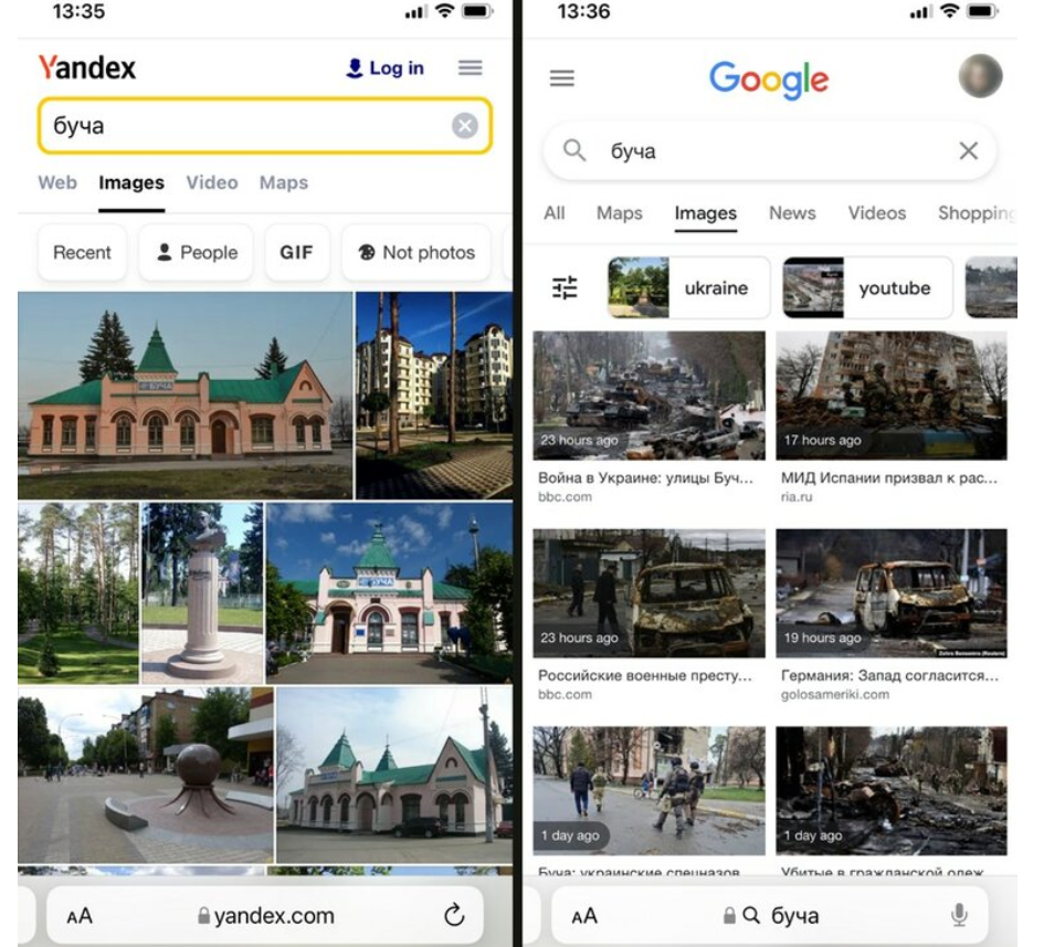 Důsledkem je, že například vyhledávání informací o vraždění v Buči ukazuje úplně něco jiného, než konkurenční Google, jak dokládá toto srovnání: