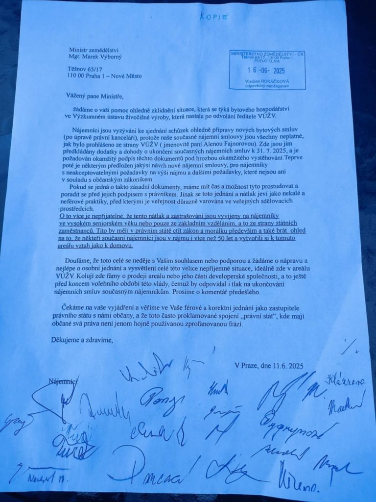 To, že podnět „od skupiny zaměstnanců a nájemníků bytového fondu Výzkumného ústavu živočišné výroby“ dostalo, ministerstvo potvrzuje.