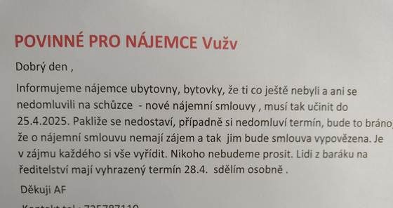 „Byl jsem na sekretariátu a tam do mě pořád hučeli, že jim mám podepsat nějaké papíry. Nakonec jsem jim něco podepsal, myslel jsem, že je to ta nová správná smlouva, ale ukázalo se, že to byla výpověď z bytu. Právník se pak chytal za hlavu, ale prý se s tím dá něco dělat. I proto, že to bylo pod nátlakem. Měl jsem smlouvu na dobu neurčitou. Podle právníka je platná. Sekretářka mi pořád tvrdila, že ne,“ říká Doktor.