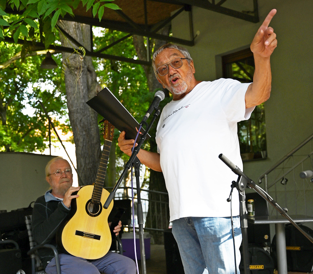 Zdeněk Bárta při projevu. Jaroslav Hutka přihlíží. Foto: Zdeněk Kovář