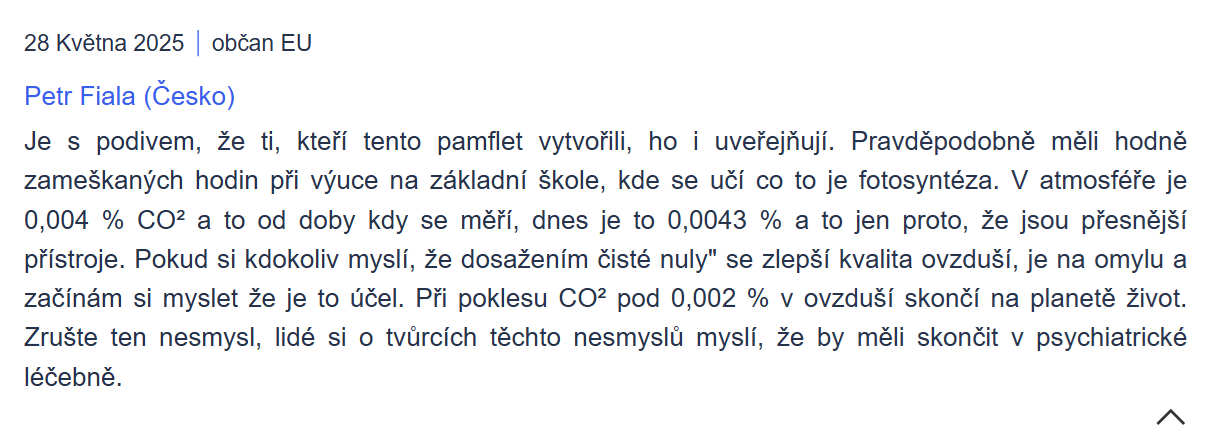 „Pokud si kdokoliv myslí, že dosažením ,čisté nuly‘ se zlepší kvalita ovzduší, je na omylu a začínám si myslet že je to účel. Při poklesu CO² pod 0,002 % v ovzduší skončí na planetě život. Zrušte ten nesmysl, lidé si o tvůrcích těchto nesmyslů myslí, že by měli skončit v psychiatrické léčebně,“ napsal 28. května autor, který se podepsal jako Petr Fiala.
