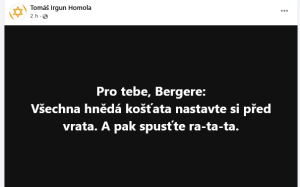 „Ostatně si myslím, Vojtěchu Bergere, že jsi stejného zrna jako Břetislav Tureček. Tedy hnědá špína,“ psal Homola v jednom z příspěvků. V jiném byla řeč o „hnědých košťatech“, která se mají „nastavit před vrata“ a „spustit ra-ta-ta“.