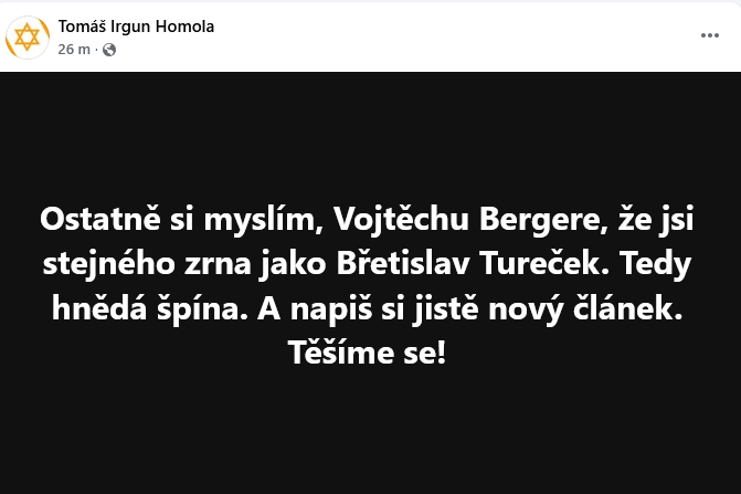 „Ostatně si myslím, Vojtěchu Bergere, že jsi stejného zrna jako Břetislav Tureček. Tedy hnědá špína,“ psal Homola v jednom z příspěvků. V jiném byla řeč o „hnědých košťatech“, která se mají „nastavit před vrata“ a „spustit ra-ta-ta“.