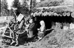 Na tomto snímku se zdravě vypadající rodina v Pskovské oblasti stěhuje z polorozpadlé chaty do nové těsně po skončení boje proti nacismu. Skutečnost byla smutnější – vzhledem k tomu, že stavební materiál byl použit na stavbu továren a dalších objektů vojenského významu, žilo mnoho vyčerpaných dělníků a kolchozníků a jejich dětí až do Malenkovovy vlády v zemljankách, často vyrobených ze stavebního odpadu. Foto z Ústředního státního archivu filmových a fotografických dokumentů Ukrajiny, kopie A. Gogun, se souhlasem autora