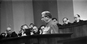 Poslední den XIX. sjezdu – Stalinův projev, který v souladu s marxistickou dialektikou hraničící s paradoxností zakončil bojovým zvoláním: „Pryč s válečnými štváči!“. Foto z Ruského státního archivu filmových a fotografických dokumentů, kopie A. Gogun, se souhlasem autora.
