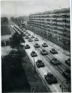 Na počátku 50. let zavedla řada zemí „socialistického tábora“ potravinové lístky, protože militarizace zabírala všechny zdroje. Na fotografii je zachycena přehlídka v Praze s portréty Stalina, Gottwalda a dalších vůdců na budově. Foto z českého vojenského archivu, kopie A. Gogun, se souhlasem autora