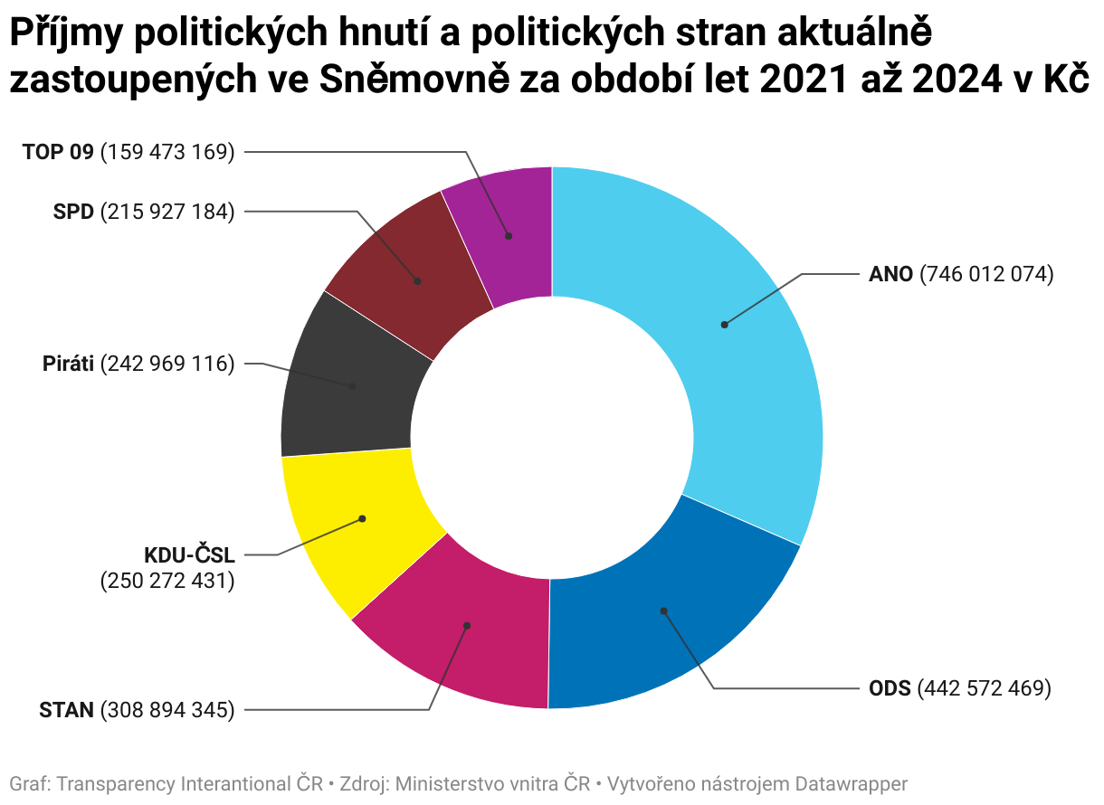 Na druhé příčce je ODS s příjmem přes 442 milionů. Následuje STAN s více než 308 miliony a KDU-ČSL s 250 miliony korun. Dalšími v řadě jsou Piráti, kteří ze státní kasy dosáhli na 242 milionů. TOP 09 si připsala 159 milionů.