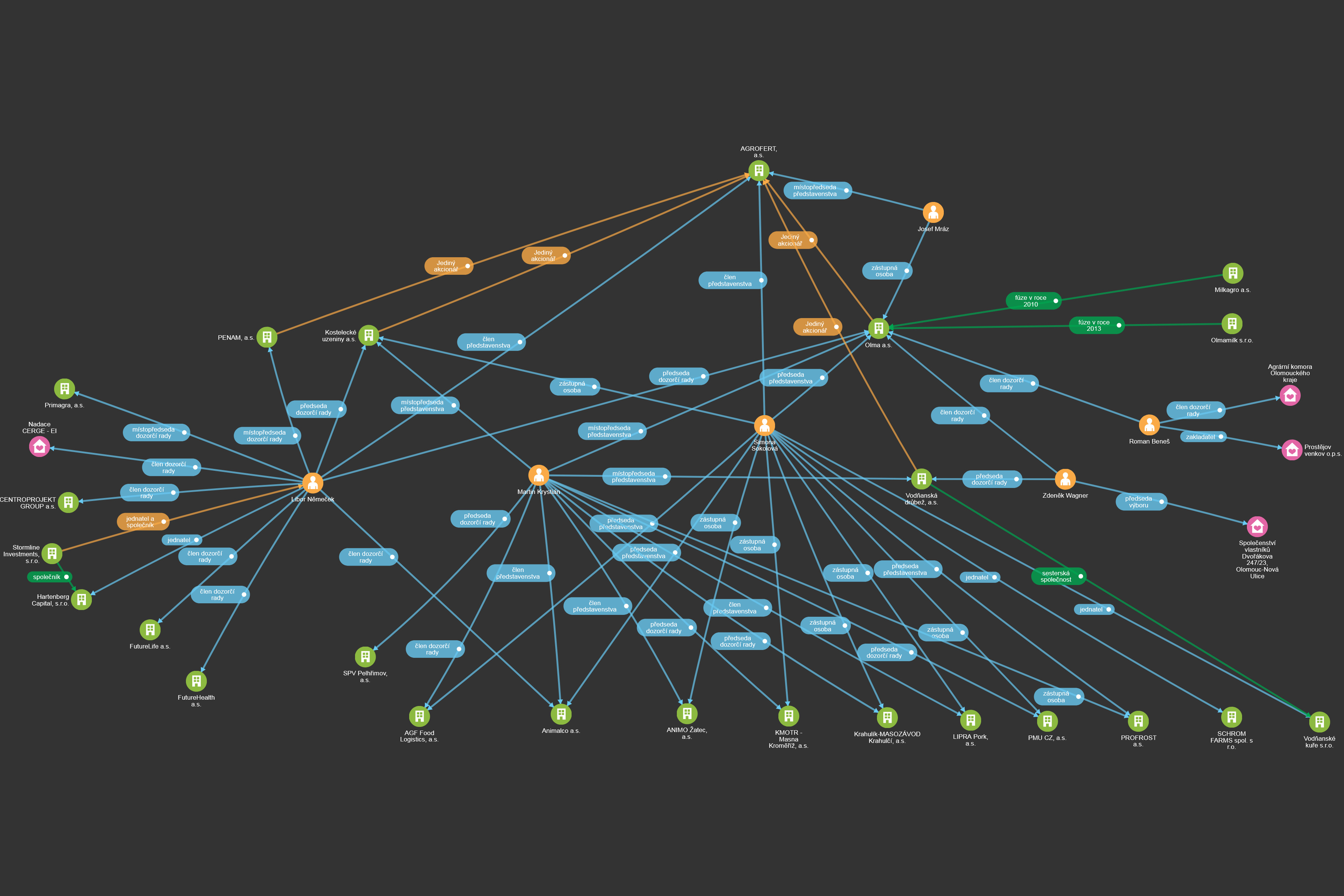 V představenstvu kromě Agrofertu zastupovaného Mrázem setrvává také ředitelka Olmy Simona Sokolová. Ta kromě nejvyšší pozice v Olmě působí v představenstvu Agrofertu a v mnoha dalších firmách představuje zástupnou osobu, stejně jako tomu je u Mráze. Agrofert zastupuje v masných závodech Kmotr a Krahulík a společnostech Lipra Pork nebo Animo Žatec, které se specializují na produkci vepřového masa. V několika dalších firmách učinkuje na pozicích statutárních orgánů, především v předsednictvech.