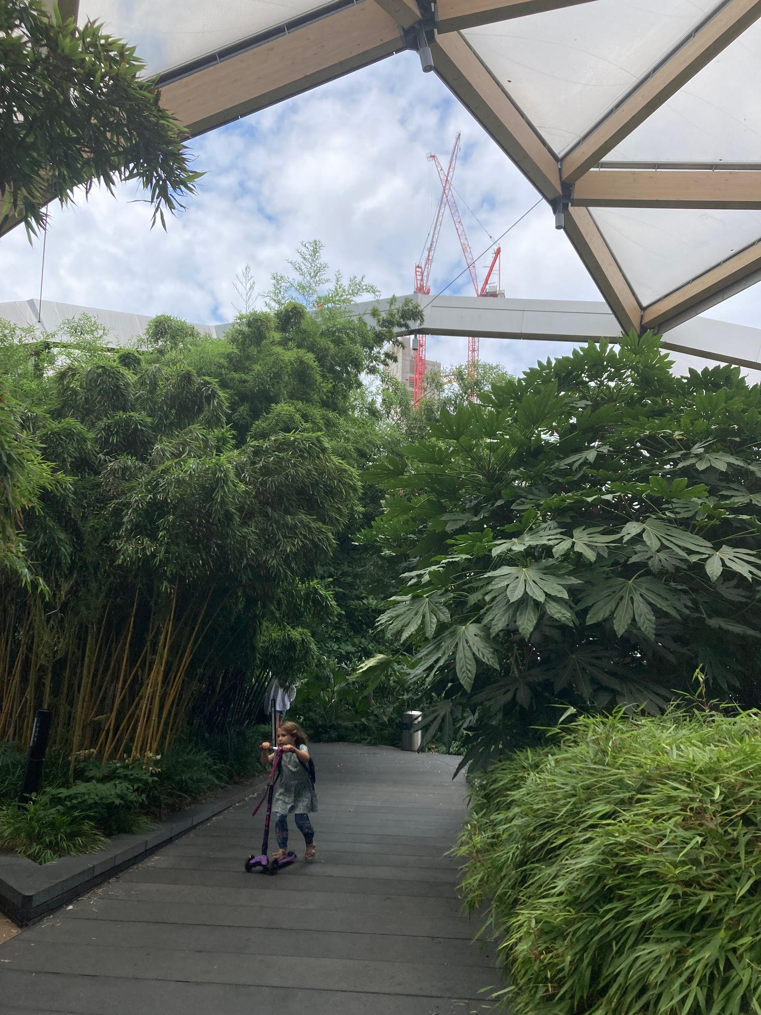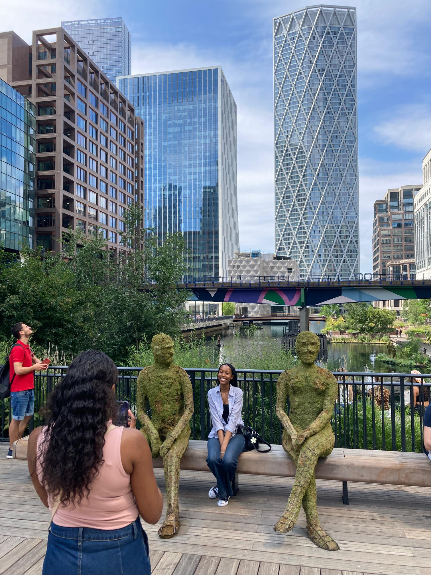 Její klidná energie se skoro bije s výhledem na futuristické panorama mrakodrapů Canary Wharf, jejichž skleněné zdi odrážejí poslední paprsky zapadajícího slunce.